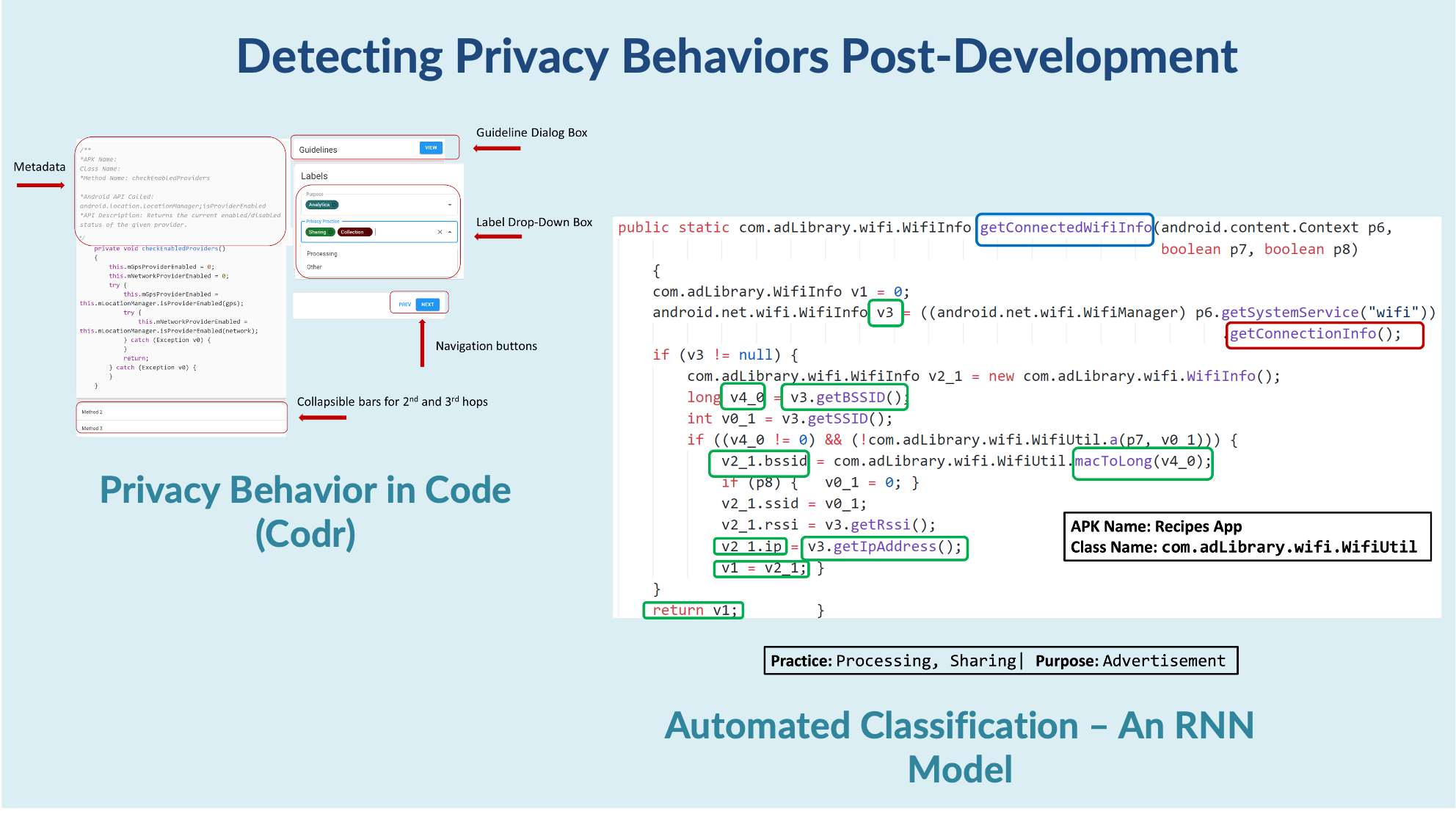 PERC_Lab long-term goal is to develop tool-supported methods, algorithms, and frameworks for minimizing privacy violations, breaches, and risks in software applications throughout their software development lifecycle. One of our goals is to provide developers with systematic approaches and tools to help create privacy-preserving applications that are compliant with current and emerging privacy regulations and best practices, thus protecting the privacy of individuals throughout the software development lifecycle (SDLC) from requirements to code generation. Another goal is to develop techniques that help users better understand the privacy implications of the IoT, mobile, and web applications they use.